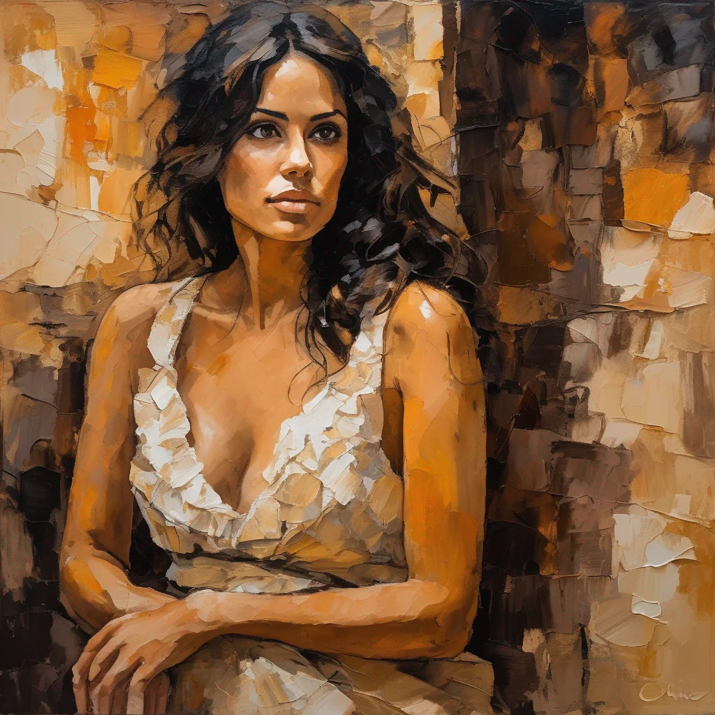 AI Image: Expressive impasto ink portrait of a beautiful brunette woman with an intense gaze, intimate three-q