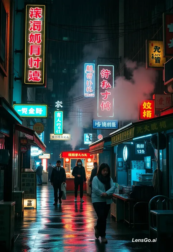 AI Image: Cyberpunk street market in the rain, neon signs and steam rising