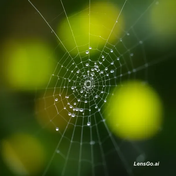 AI Image: Macro photograph of morning dew on spider web, bokeh background