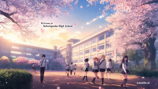 AI Image: Shot 1 Anime cinematic sunrise over modern high school, cherry blossoms falling, students walking, s