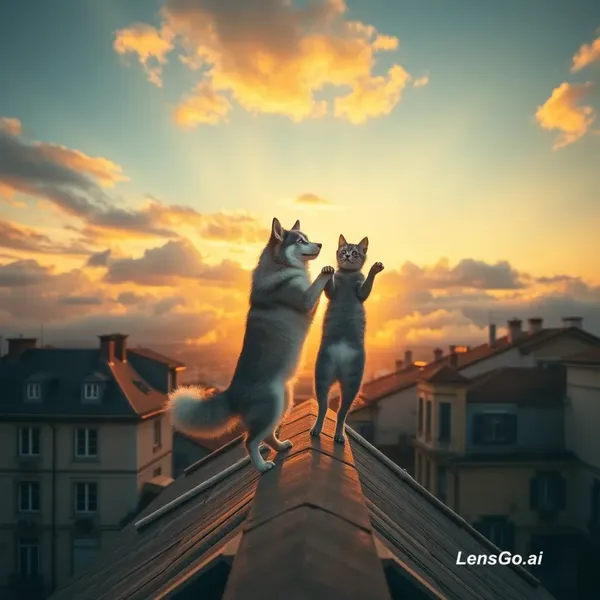 Cinematic aerial top shot looking down from the sky. The camera rapidly descends through the clouds towards a rooftop in a vintage European city during sunset. On the rooftop, a fluffy husky dog and a small gray cat are standing on their hind legs, dancing together gracefully. The cat twirls under the dog's arm. Warm golden hour lighting, soft shadows, slow motion, hyper-realistic, 8k resolution, film grain texture.