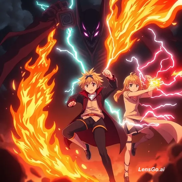 AI Image: “3 anime friends fighting a dark villain, fire and lightning powers, cinematic camera, dramatic ligh