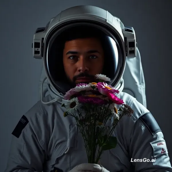 AI Image: Studio portrait of an astronaut holding flowers, dramatic lighting