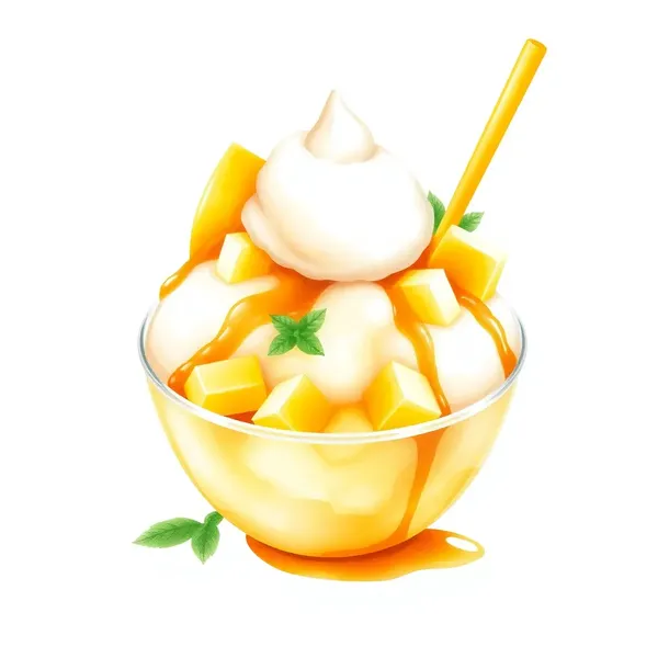 AI Image: /imagine prompt: Taiwanese mango shaved ice dessert with a scoop of vanilla ice cream on top and fre