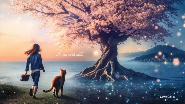 Il fait beau le soleil brille et Anna est là devant la mer une veste en jean et un livre sous la main elle court en direction d’un grand cerisier au loin il brille et quelque chose l’attire! Soudain elle est transporté dans un mode inconnu et change de lieu elle se retrouve au pied de l’arbre et celui ci à la tête en bas des lucioles brille dans le ciel et au loin un village se trouve sur une montagne ! De la musique résonne elle tourne la tête et de l’autre côté c’est le jour qui trône ! Elle ne comprend pas pourquoi le jour embrasse la nuit elle avance attire avec les luciole son petit chat à ses pieds se met à parler il lui dit qu’elle est dans un nouveau monde et qu’une nouvelle aventure s’offre à elle elle se met à le suivre vers les montagnes, shot on modular 8K digital cinema camera, standard prime lens, 35mm standard natural perspective, f/1.4 shallow depth of field, creamy bokeh, professional cinematography, ultra-detailed, 8K resolution, film grain, cinematic color grading