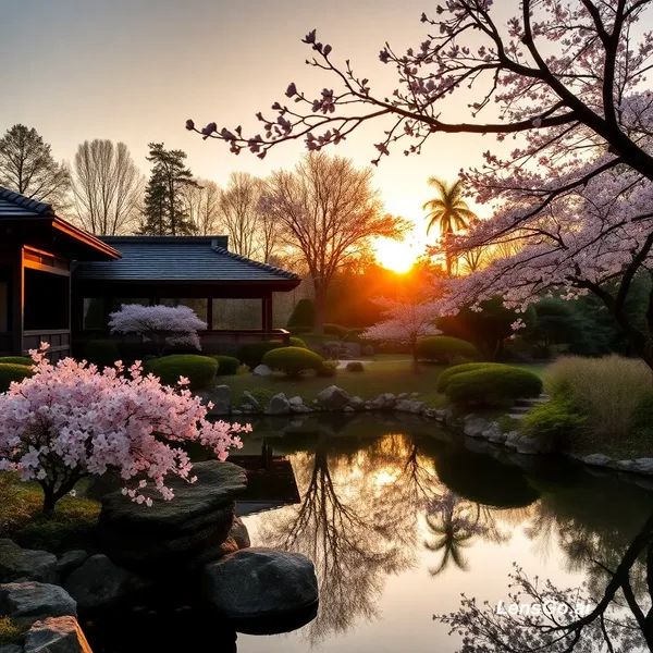 AI Image: A serene Japanese garden at golden hour, koi pond reflecting cherry blossoms