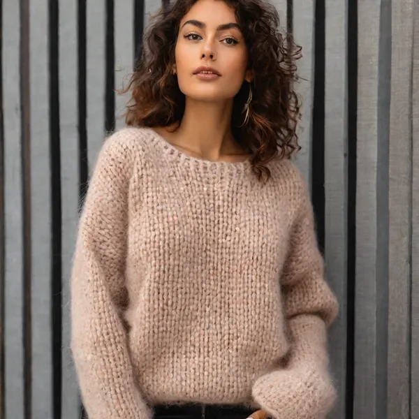 AI Image: Jeune femme brune portant un fabuleux pull en mohair douillet et très moelleux