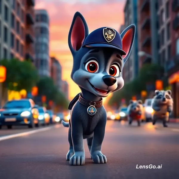 Pixar-style 3D animated blue heeler police dog, female, cute oversized head, big expressive eyes, soft blue-gray fur with darker patches, wearing a polished police uniform with badge, belt, and cap. Scene set in a colorful city street at sunset with cinematic lighting, soft shadows, and slightly blurred background. The dog stands heroically, then notices trouble and runs toward silly cartoon villains (harmless raccoon bandits). Dynamic action sequence: slow-motion leap over a car, exaggerated cartoon physics, smooth motion blur, spinning mid-air. Playful, non-violent fight: gently knocking foes aside, using cartoon gadgets like magical cuffs, comedic reactions. Ends with the dog landing in a heroic pose, smiling warmly, police lights glowing softly behind her. Family-friendly, heartwarming tone, vibrant colors, highly detailed fur, smooth animation, expressive character acting. Duration: 20 seconds, cinematic camera movement, high detail, polished Pixar-like rendering.