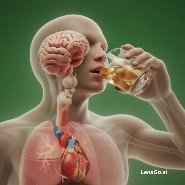 Cinematic shot of human holding a glass of garlic liquid, slow motion as the glass approaches the lips. Camera slowly pushes in, outer skin becomes semi-transparent revealing internal organs. Soft volumetric lighting, green background.