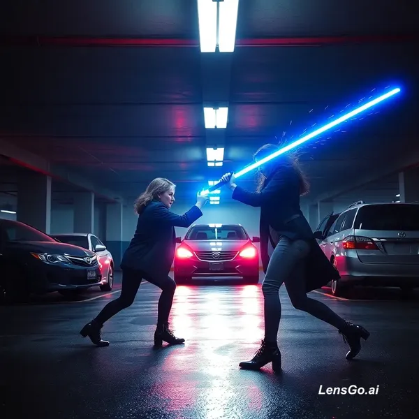 The mechanical breathing swallows the street traffic, echoing off the damp concrete. Red light bleeds across the wet asphalt. He steps into the fluorescent glare, a black monolith towering in the center of the downtown parking garage. She doesn't step back. She doesn't even unbutton her everyday coat. A snap-hiss tears the damp air. Pure blue light washes over her face. The first clash rattles the teeth. Sparks shower over the hood of a parked sedan. He drives heavy, two-handed strikes downward, his boots splintering the pavement with every advance. She pivots, ducking a sweep that singes the concrete pillar behind her. The air suddenly grows heavy. He raises a black, leather-clad hand, his fingers curling into a slow fist. Her boots drag backward. The invisible grip tightens around her throat. She chokes, dropping to one knee. Her hair falls across her face, but her grip on the blue hilt never loosens. She forces herself up, breath hitching, driving the glowing blade into the asphalt to anchor her weight. He steps in for the execution. She twists. A sudden, violent pivot inside his guard. The blue beam shears upward, tearing through armor and circuitry. The red blade flickers and dies. The breathing stops entirely. A heavy thud shakes the ground. She stands over the scorched black helmet, her clothes perfectly unchanged, listening to the hum of her own blade in the quiet dark.