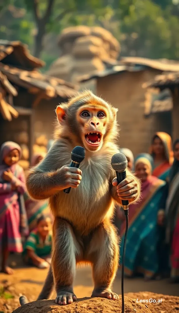 AI Image: Samajh gaya 😄 tum ek funny + cinematic village scene banana chahte ho with monkey 🎬 Yeh lo ek impr