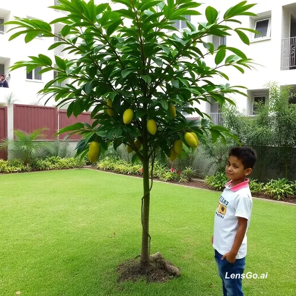 Niño Santiago Santana de colegio IED Alexander von Humboldt de Barranquilla en su exposición sobre la siembra de arbol de guanabana, no mayor a 1 metro de altura, en el jardin del conjunto residencial