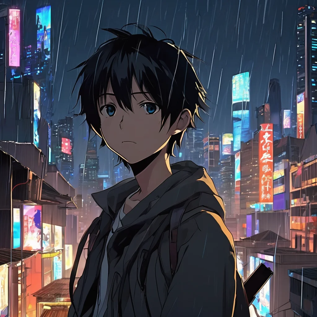 Create a anime style video of 15 minute SCENE1 Rain pours over a silent city. Neon lights blur through the storm. On a high rooftop, a young boy stands alone, dark clothes soaked, a blade glinting in his hand. Behind him stands Kuro, tall and calm. Kuro: You never miss, Roki. That’s why they call you the best. Roki stays silent. His eyes look far older than his age. Roki (cold): This is my last job. Kuro smiles faintly. Kuro: People like us don’t get last jobs. You can’t escape who you are