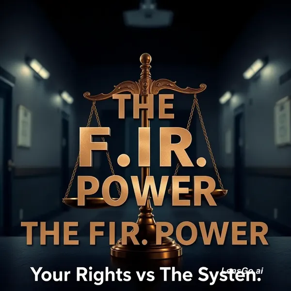 A high-contrast, cinematic shot of a golden scale of justice balanced against a dark police station backdrop. Bold, metallic text: "THE F.I.R. POWER" with a sub-heading: "Your Rights vs. The System."