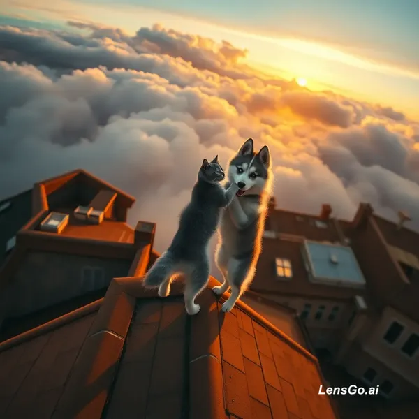 Cinematic aerial top shot looking down from the sky. The camera rapidly descends through the clouds towards a rooftop in a vintage European city during sunset. On the rooftop, a fluffy husky dog and a small gray cat are standing on their hind legs, dancing together gracefully. The cat twirls under the dog's arm. Warm golden hour lighting, soft shadows, slow motion, hyper-realistic, 8k resolution, film grain texture.