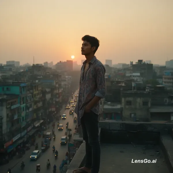 AI Image: "A cinematic video of a Bangladeshi young man standing on a rooftop in Dhaka during sunset. The envi