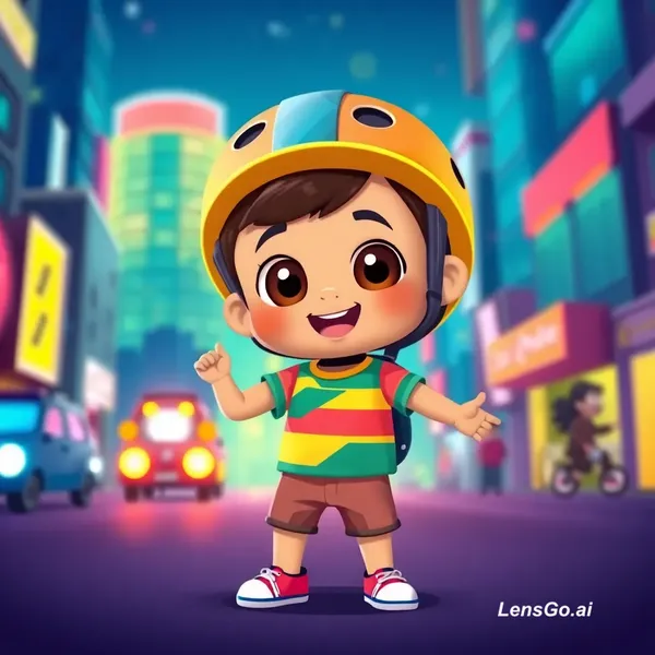 Cute 2D/3D cartoon style like Cocomelon, bright vibrant colors, glowing neon city night background, happy energetic music, big friendly eyes wala little boy (8-9 saal ka, wearing colorful t-shirt + shorts + helmet), smooth simple animation.