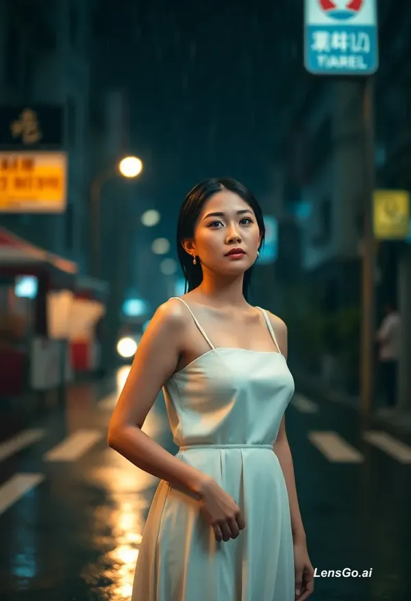 AI Image: a beautiful asian korean woman is wearing white dress, is sad, walking down a street, under a heavy