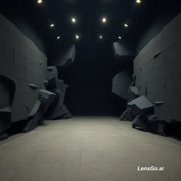 El espacio se presenta extremadamente tenso y agresivo, con una atmósfera oscura, cargada y visualmente caótica. Las formas rígidas y cortantes estallan en distintas direcciones, rompiendo cualquier sensación de orden y generando un ambiente de confrontación constante. Elementos angulosos y fragmentados invaden el espacio, dificultando la lectura y el recorrido. Predominan materiales pesados como acero expuesto, hormigón bruto y superficies irregulares, reforzando la sensación de densidad y violencia espacial. La iluminación es intensa, desigual y altamente contrastada, creando choques abruptos entre luces duras y sombras profundas. El uso dominante de colores oscuros enfrentados con rojos intensos intensifica la percepción de explosión emocional, desborde y agresividad incontrolada.