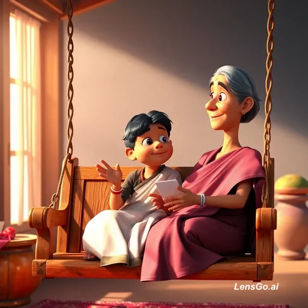 AI Image: "An emotional 3D animation of an Indian grandmother sitting on a wooden swing (jhoola) with her litt