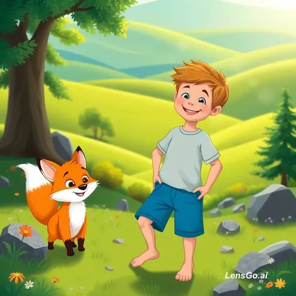 AI Image: t and blue shorts, barefoot and smiling happily. The fox is small, fluffy, bright orange with white