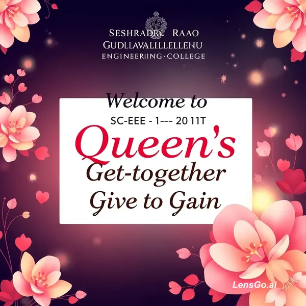 Create a landscape‑orientation poster with a vibrant, elegant theme suitable for a ladies’ get‑together event. Use rich pastel or dark feminine colors (designer-like aesthetic). Include soft gradients, floral elements, abstract shapes, sparkles, and a classy modern layout. Text to include clearly: "Seshadri Rao Gudlavalleru Engineering College" "Welcome to SRGEC ECE‑IoT Queen's Get‑together Give to Gain " as given in the photo attached by me Design should look festive, warm, and sophisticated with beautiful typography, gentle lighting, and well-balanced composition. Use high resolution for display on a large screen.