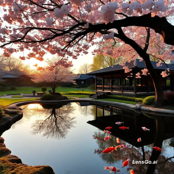 AI Image: A serene Japanese garden at golden hour, koi pond reflecting cherry blossoms