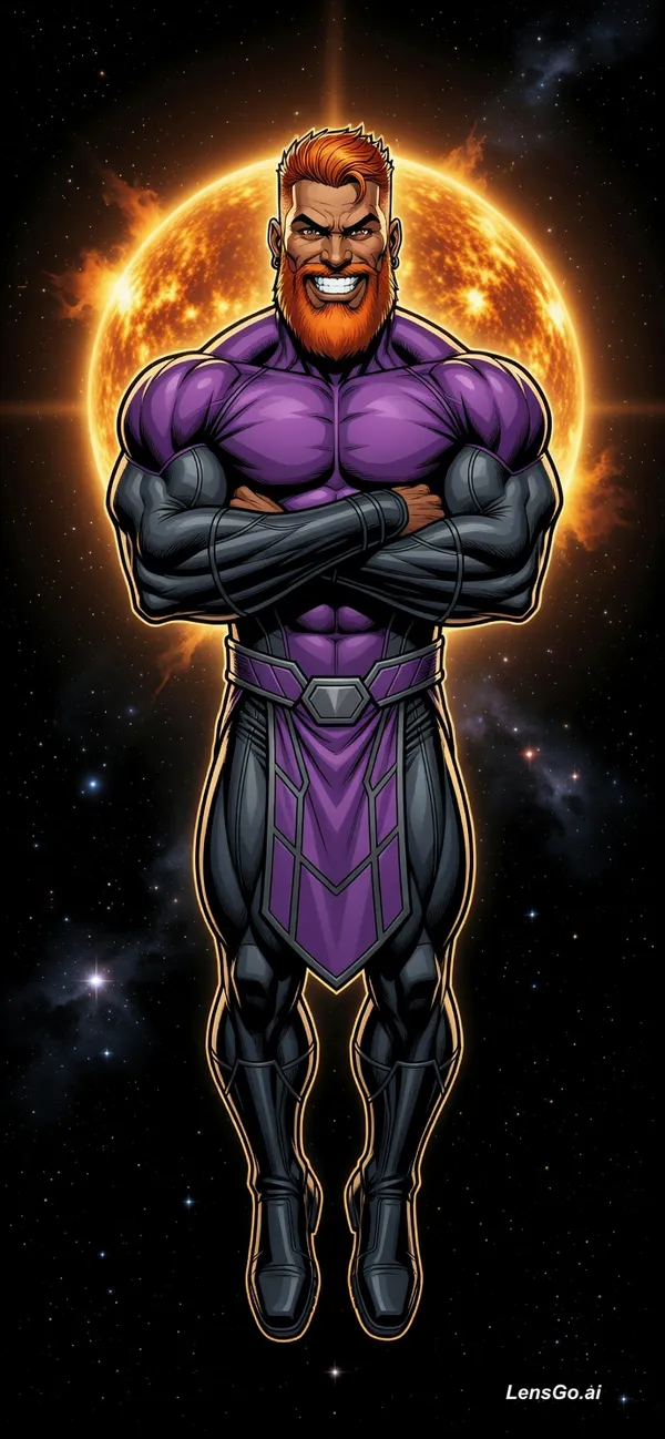 Show him in a front facing(((Floating in air like a villain with arms crossed at chest ))) and feet pointed down.he's in the void of space with a sun in background and a devilish grin