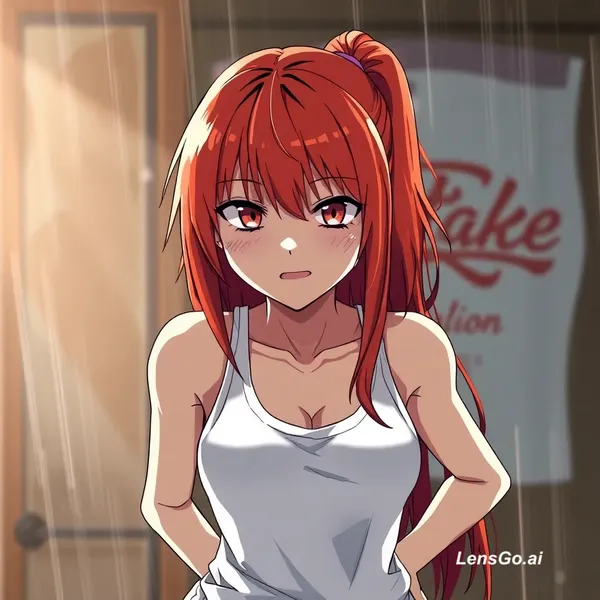 AI Image: Anime girl, red haired, White tank top, hands on The hips,heavy breathing, drenched in sweat