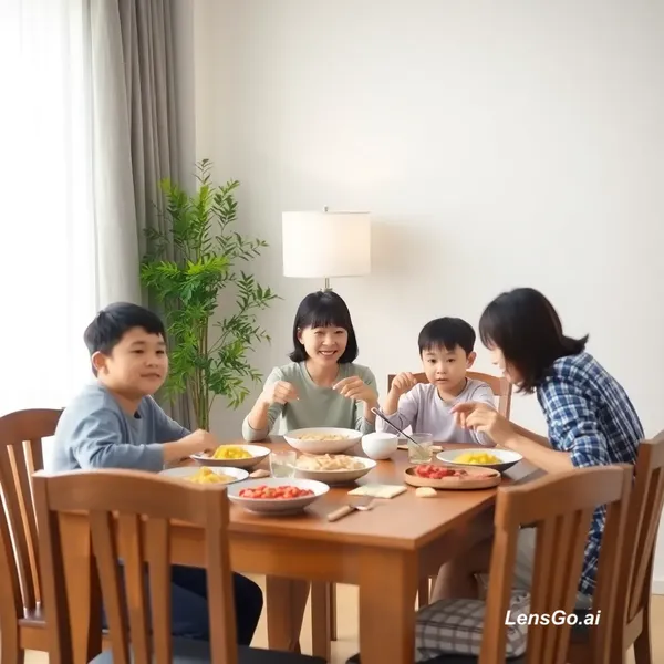 AI Image: a Chinese family having lunch in a dining room . There are 2 parents and two children. The table is