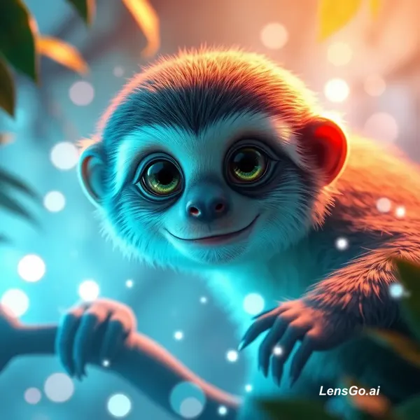Ethereal fantasy portrait with magical glowing particles, enchanted jungle background, soft dreamy lighting, highly detailed featuring a monkey similar to the sloth found in unsloth.ai website