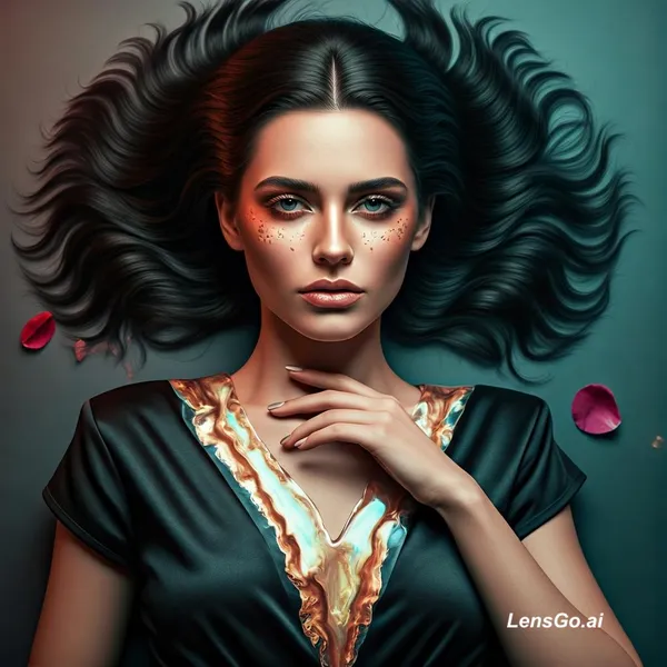 A straight-on, recumbent close-up of a young woman with lustrous, porcelain skin, her head turned delicately towards camera as her hand rest gently atop her collarbone, providing a subtle framing of the face. Her sharp, angular black dress is rendered in a slick matte satin, contrasting against luminous, translucent peony petals and a burned iridescent resin overlay that pools asymmetrically across her chest, creating a captivating duality between fashion and organic fantasy elements. Her makeup is artistic, with warm, rose-gold shimmer pressed on high points of her cheeks and collarbone, complemented by soft gloss lips and subtle smoke-gray shadow at the eyes. Hair is sleek, brushed out and splayed with dynamic tension. She appears atop a plush, minimal platform in a cyclorama studio, with an ethereal airbrushed cloud background and floating refractive light leaks, producing a faint, soft bloom. Light is diffuse, split-lit with an amber key and deep teal rim, casting low, fluid luminous shadows. The polarized palette contrasts shell pink and peachy skin tones against nightfall blue and cool gray. The symmetrical composition, with notably shallow DOF on her features and resin overlay, is polished; digital high-resolution editorial photography, enhanced with diffusion glows, iridescent overlay compositing, negative-space gradients, and iridescent filter effects. Mood is dreamy, intimate, and contemplative.