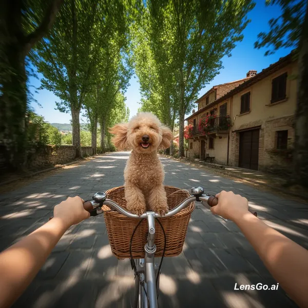 Wide-angle first-person view, hands of a young woman holding a bicycle handlebar, a wicker basket attached to the bike with a toy poodle inside. The dog's curly fur flutters softly in the breeze, head slightly raised, eyes squinting from the wind, with a cheerful and elegant expression. The bicycle rides along a narrow stone-paved road through an archway of tall green trees, sunlight filtering through the leaves, creating moving spots of light and shadow on the road and hands. Italian village details in the background: terracotta roofs, balconies with flowers, wooden shutters. Clear sunny day with a deep sky gradient from rich blue above to lighter near the horizon, sense of endless road perspective, calm warm atmosphere, gentle wind motion.
