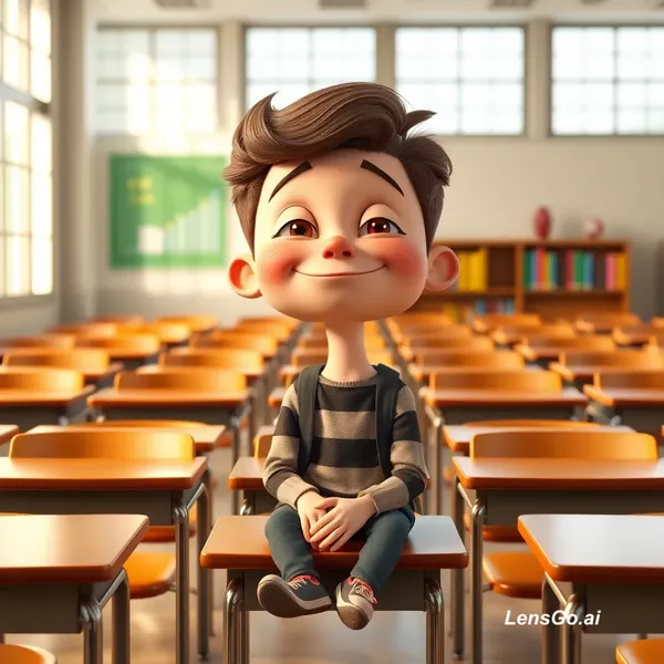 "A funny 3D cartoon student with a big head and tiny body, making a silly face, sitting in a super clean and organized classroom, shiny desks, neat rows of chairs, bright sunlight coming through large windows, colorful books perfectly arranged, playful expression, exaggerated features, Pixar-style animation, vibrant colors, soft cinematic lighting, highly detailed, depth of field, 4K, ultra quality, octane render, unreal engine style"