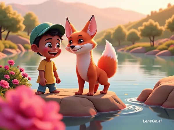 A high-quality 3D cartoon style illustration of a young Somali boy named Hirsi playing with his fox best friend near a clear flowing river. Hirsi has warm brown skin, big expressive eyes, short black hair, wearing a green cap, yellow t-shirt and blue shorts, barefoot and smiling happily. The fox is small, fluffy, bright orange with white chest and tail tip, playful and friendly. They are in a beautiful green landscape with trees, flowers, rocks, and soft sunlight. Background includes rolling hills.