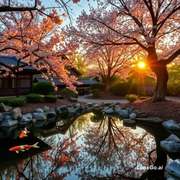 AI Image: A serene Japanese garden at golden hour, koi pond reflecting cherry blossoms