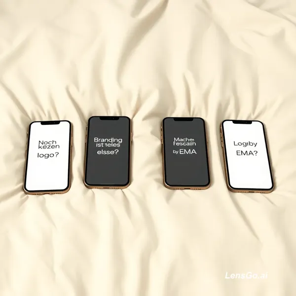 A static, ultra-realistic scene of four modern iPhones placed on a clean, smooth beige bed with soft natural lighting. The background, bed, and phones remain completely still. No camera movement. Only the phone screens animate with subtle, realistic swipe movements, one after another, not at the same time. The animation is minimal and smooth, like real phone usage. The text on each phone screen must be exactly: Phone 1: "Noch kein Logo?" Phone 2: "Branding ist alles." Phone 3: "Mach es richtig" Phone 4: "Logo by EMA" The text must be perfectly readable, clean, centered, modern, with no distortion or spelling errors. It should look like a real smartphone screen interface with a minimal luxury style. No movement except the screens. Ultra-realistic, high-end commercial look, soft shadows, clean aesthetic.