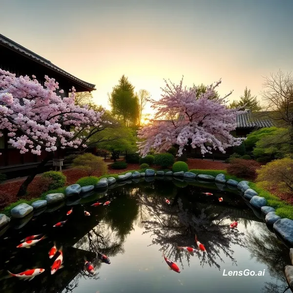 AI Image: A serene Japanese garden at golden hour, koi pond reflecting cherry blossoms