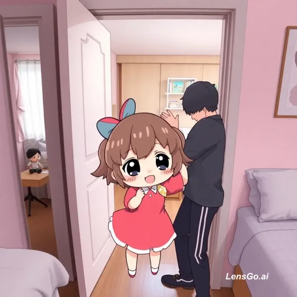 AI Image: Cute wuwa Pheobe Chibi opens door to bedroom for camera man and smiles. camera man walks in and pick