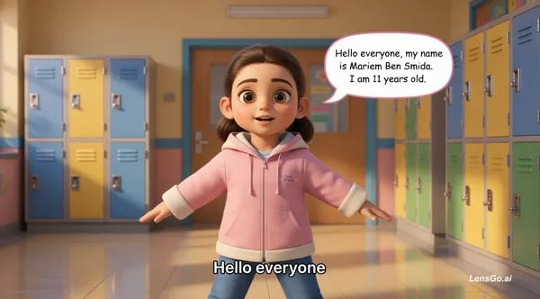 A 3D cartoon animated Tunisian girl wearing a pink hoodie, standing in a school hallway, soft lighting, Pixar-style animation, smooth camera slight zoom in, natural facial expressions, she looks at the camera and speaks clearly. Lip sync animation: "Hello everyone, my name is Mariem Ben Smida. I am 11 years old." Style: - 3D cartoon animation (NOT realistic) - expressive face and eyes - smooth mouth movement synchronized with speech - warm lighting - cinematic camera movement - high quality animation