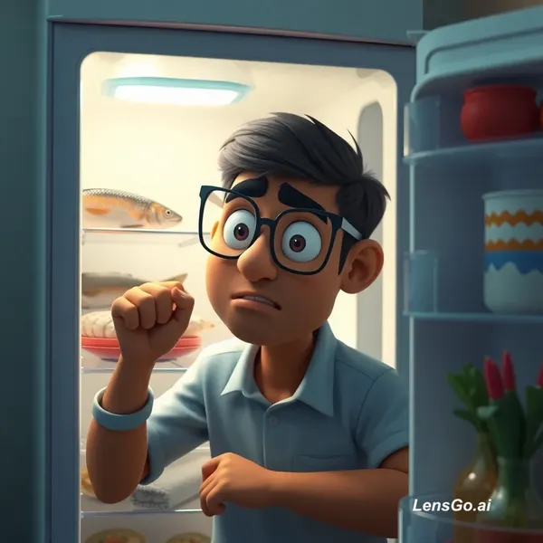 এবার পরেরটা বানিয়ে দাও এই কুকুরটি নিয়েই Prompt 2: A comedic 3D animation style image of a confused young South Asian man looking inside an open refrigerator in his room. He has his glasses pushed up on his forehead. He is searching for his glasses among the food items like fish and vegetables. Funny expression, cool light coming from the fridge, highly detailed.
