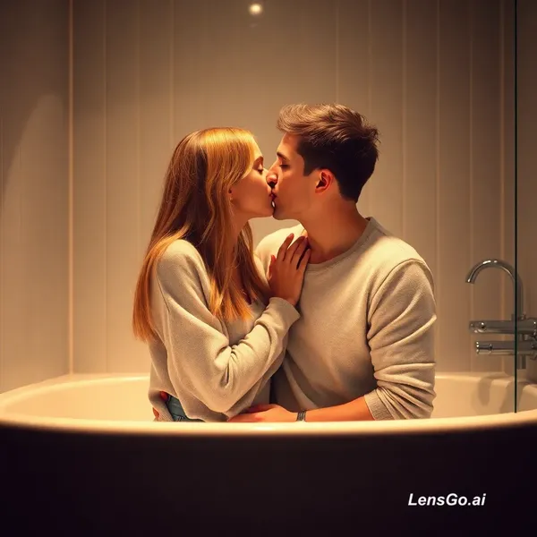 AI Image: Due giovani adulti (18+) che si baciano teneramente davanti a uno specchio, scena in stile selfie sp