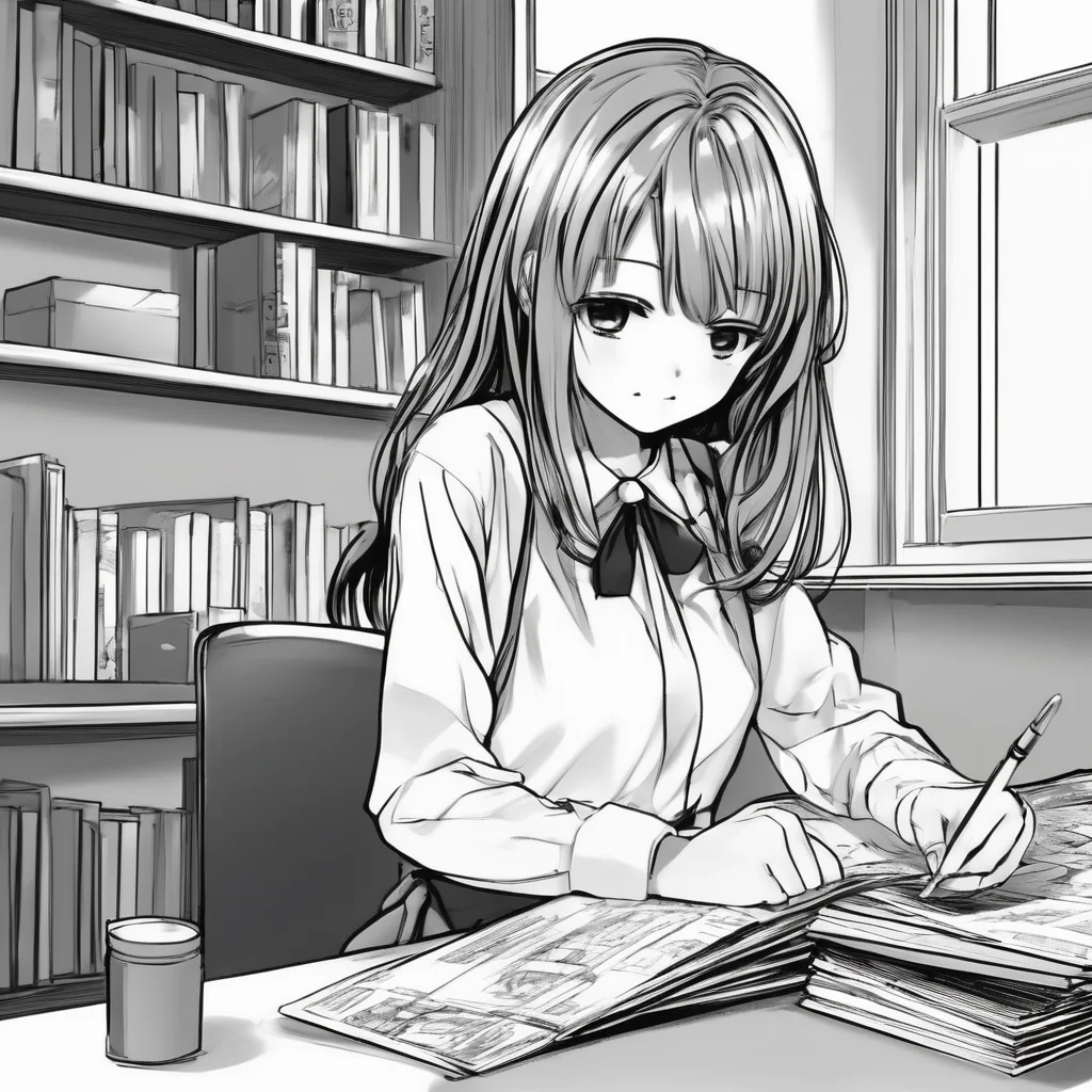 Generate a video likely to be a manga girl school student with long two plates hair style just nothing simply thinking with her pen spinning ( with a comic book box for me to type) at last she should keep her pen down and blink thrice ( thinking what she was thinking about )