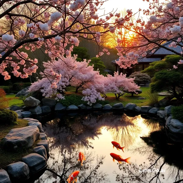 AI Image: A serene Japanese garden at golden hour, koi pond reflecting cherry blossoms