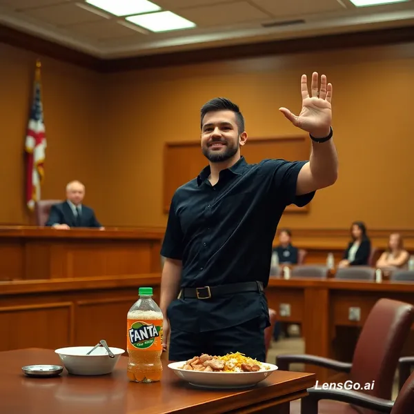 Use the uploaded image as reference to generate a image of me wearing a black shirt, dark shorts standing in a courtroom while a judge shouts order, the man raising his hand like he wants to order food, rice chicken and Fanta appearing on the table