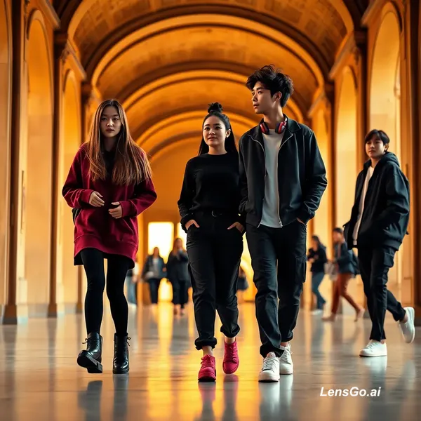 inematic slow-motion shot of three fashionable students walking and talking through grand college hallway with arched ceilings and warm golden lighting. Diverse students in background turning to stare at the trio. All three students same height, walking in sync, natural conversation, confident poses. LEFT - American girl: Long straight brunette hair flowing down, wearing oversized maroon hoodie dress (extra long, reaches mid-thigh/knees), black leggings, black combat boots, casual confident walk. CENTER - Korean girl: Sleek black hair styled in high bun, wearing black cropped ribbed sweater (shows midriff), baggy black cargo pants, pink chunky platform sneakers, trendy streetwear style. RIGHT - Korean boy: Messy curtain bangs hairstyle, wearing black oversized bomber jacket (unzipped/open), white t-shirt underneath, black relaxed-fit pants, white sneakers, wireless headphones around neck, casual cool vibe. Minimal modern architecture, large arched windows, warm cinematic lighting, shallow depth of field, background students blurred but looking. 8K resolution, high-fashion commercial, realistic photography style, golden hour atmosphere.