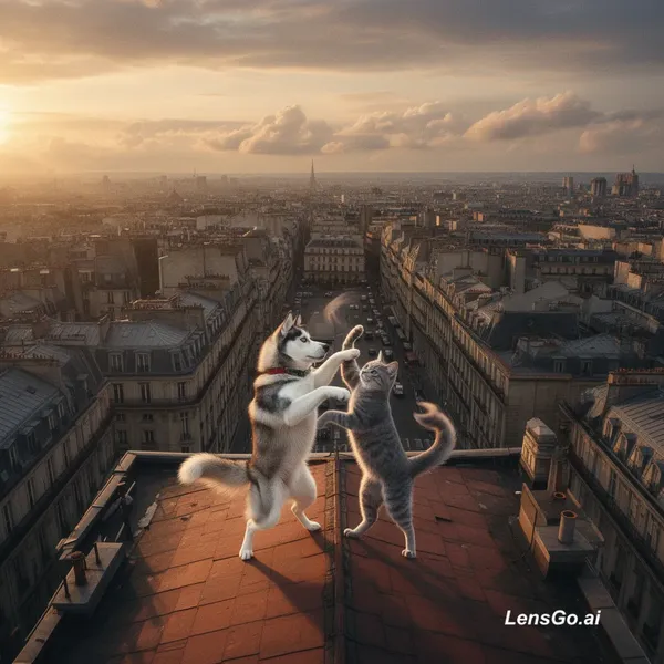Cinematic aerial top shot looking down from the sky. The camera rapidly descends through the clouds towards a rooftop in a vintage European city during sunset. On the rooftop, a fluffy husky dog and a small gray cat are standing on their hind legs, dancing together gracefully. The cat twirls under the dog's arm. Warm golden hour lighting, soft shadows, slow motion, hyper-realistic, 8k resolution, film grain texture.