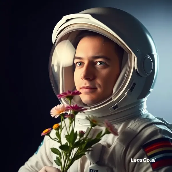 AI Image: Studio portrait of an astronaut holding flowers, dramatic lighting