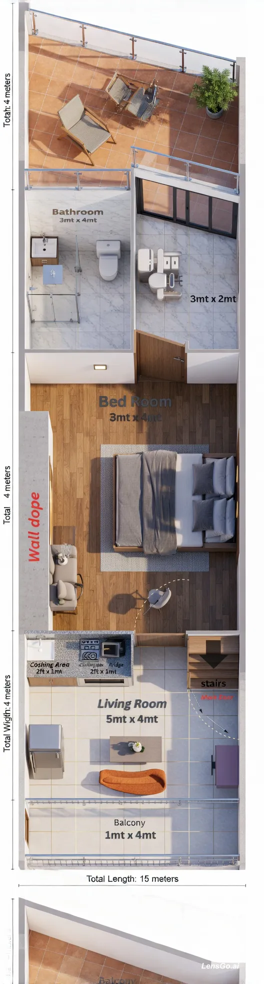 This is the layout I have made in Canva. The total floor size is 15 meters in length and 4 meters in breadth. I am planning to construct one more floor, so I created this layout for planning. The vertical dotted lines divide the width into 4 equal parts, each measuring 1 meter. The horizontal dotted lines are also spaced at 1 meter each, covering the total length of 15 meters. Each dotted box represents an area of 1 square meter (i want a good looking 3d plan and additional future as well and give me so i can submit to the builder ) give me an image
