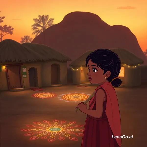 AI Image: Visual: A small village in India at sunset. Mud houses, rangoli outside doors, warm orange sky. Acti
